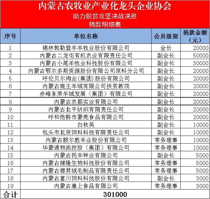 內(nèi)蒙古農(nóng)牧業(yè)產(chǎn)業(yè)化龍頭企業(yè)協(xié)會,作為自治區(qū)各級產(chǎn)業(yè)化重點(diǎn)龍頭企業(yè)的聯(lián)合體,始終堅持以習(xí)近平總書記“三農(nóng)”思想為根本遵循,圍繞協(xié)會“溝通、服務(wù)、自律、發(fā)展”的工作宗旨,發(fā)揮協(xié)會的橋梁和紐帶作用,堅持為企業(yè)服務(wù)、為行業(yè)服務(wù)、為政府服務(wù)、為農(nóng)牧民服務(wù)。協(xié)會在自治區(qū)農(nóng)牧廳的指導(dǎo)下,將繼續(xù)堅持投身助力內(nèi)蒙古脫貧攻堅工作中,貢獻(xiàn)自己的力量。