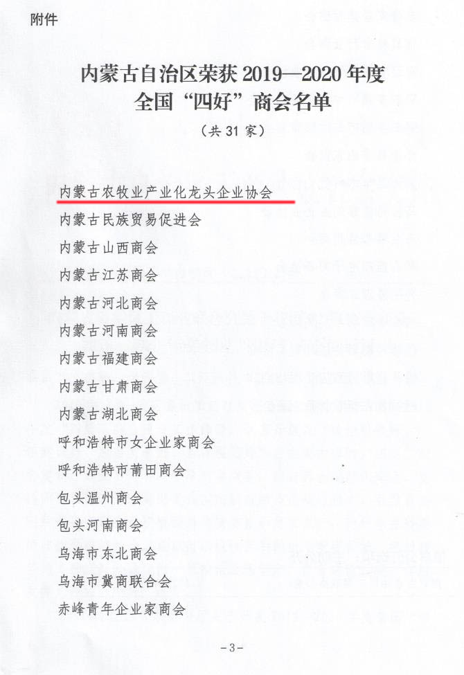 標(biāo)題:喜報(bào)!內(nèi)蒙古農(nóng)牧業(yè)產(chǎn)業(yè)化龍頭企業(yè)協(xié)會榮獲全國“四好”商會榮譽(yù)稱號