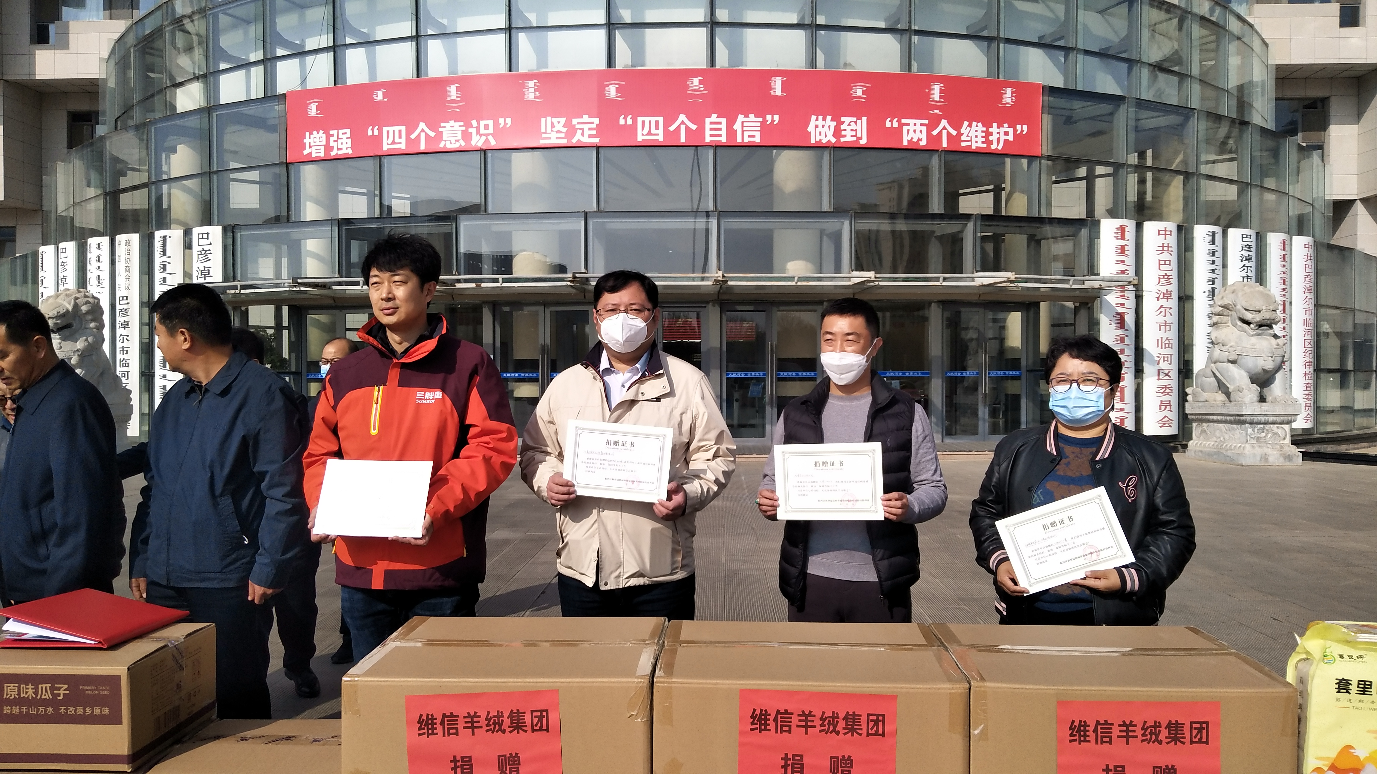11月5日中午,維信羊絨集團(tuán)等7家會員單位向巴彥淖爾市臨河區(qū)抗疫捐贈物資,捐贈儀式在臨河區(qū)政府辦公樓前舉行,區(qū)委副書記、政法委書記陳海維參加活動(dòng)并講話,對愛心企業(yè)的高尚情操給與了高度評價(jià),區(qū)政協(xié)副主席劉浩主持了捐贈儀式。