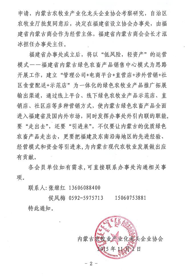 關于成立內(nèi)蒙古農(nóng)牧業(yè)產(chǎn)業(yè)化龍頭企業(yè)協(xié)會福建省辦事處的通知