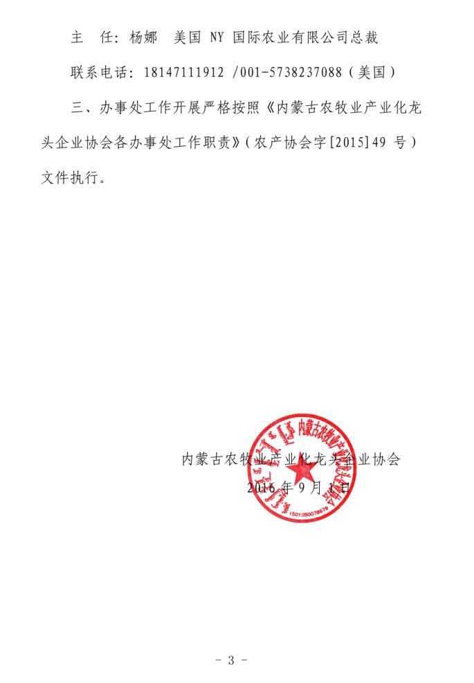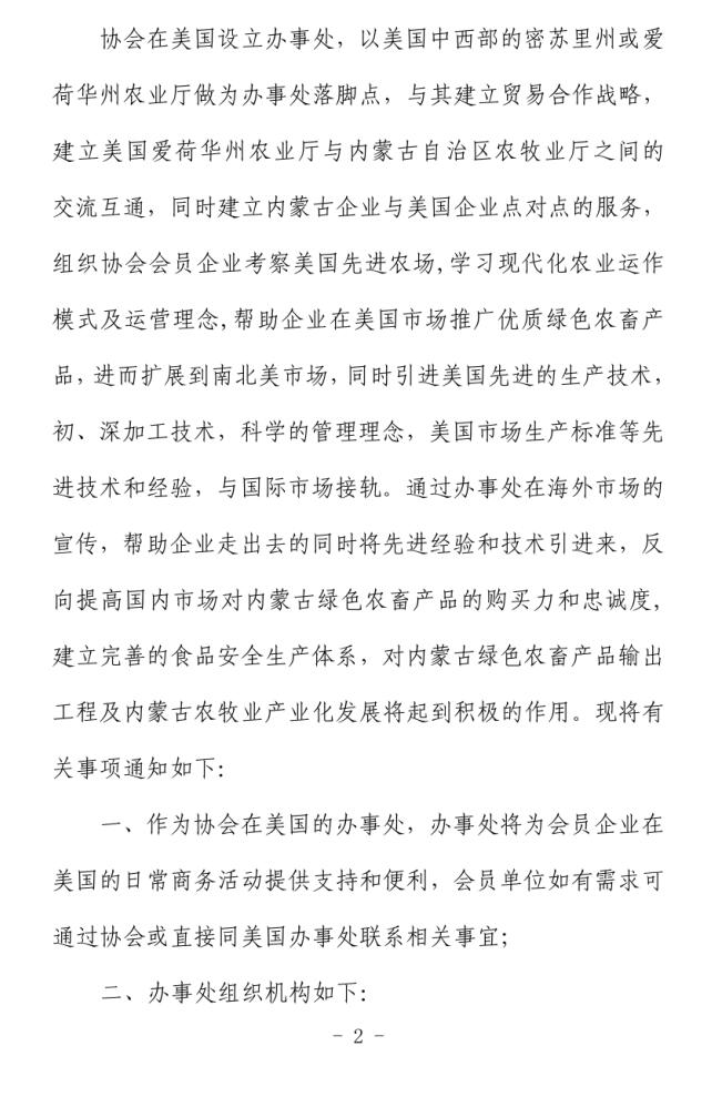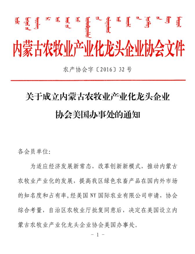關(guān)于成立內(nèi)蒙古農(nóng)牧業(yè)產(chǎn)業(yè)化龍頭企業(yè)協(xié)會(huì)美國(guó)辦事處的通知