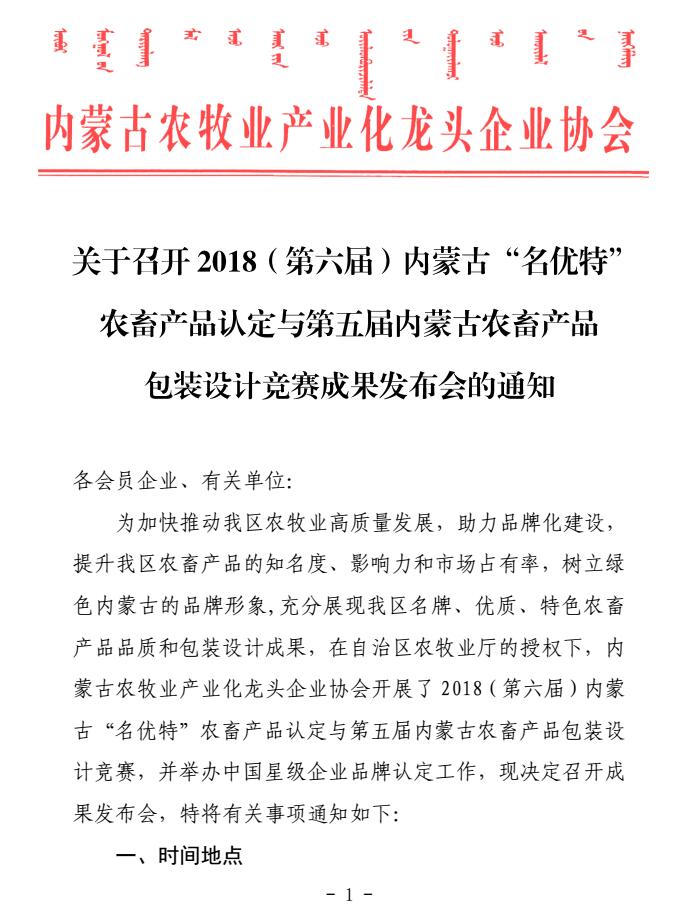 關(guān)于召開2018(第六屆)內(nèi)蒙古“名優(yōu)特”農(nóng)畜產(chǎn)品認(rèn)定與第五屆內(nèi)蒙古農(nóng)畜產(chǎn)品包裝設(shè)計競賽成果發(fā)布會的通知